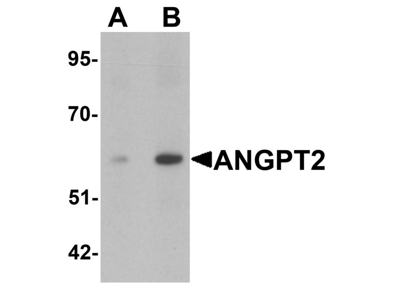 Western blot: Human liver tissue lysate stained with ARG54915 anti-Angiopoietin 2 antibody at (A) 1 and (B) 2 ug/ml dilution.
