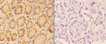 Immunohistochemistry: Paraffin-embedded Human stomach carcinoma tissue stained with ARG43265 anti-Angiopoietin 4 antibody at 1:50 dilution (left). Negative control: Using PBS instead of primary antibody (right).