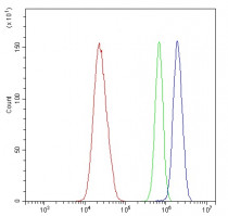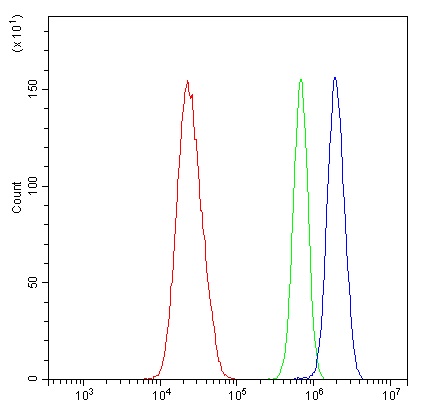 Flow Cytometry: U2OS cells were blocked with 10% normal goat serum and then stained with ARG59661 anti-Annexin A8 antibody (blue) at 1 µg/10^6 cells for 30 min at 20°C, followed by incubation with DyLight®488 labelled secondary antibody. Isotype control antibody (green) was rabbit IgG (1 µg/10^6 cells) used under the same conditions. Unlabelled sample (red) was also used as a control.