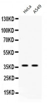 Western blot: 50 µg of samples under reducing conditions. HeLa and A549 whole cell lysates stained with ARG59661 anti-Annexin A8 antibody at 0.5 µg/ml, overnight at 4°C.