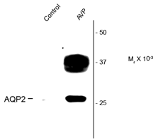 | Background | Aquaporin 2 (AQP2) is a hormonally regulated water channel located in the renal collecting duct. Mutations in the AQP2 gene cause hereditary nephrogenic diabetes insipidus in humans (Iolascon et al., 2007). A vasopressin induced cAMP increase results in the phosphorylation of AQP2 at serine-256 and its translocation from the intracellular vesicles to the apical membrane of principal cells (van Balkom et al., 2002). Serine-269 has been recently identified as a vasopressinmediated phosphorylation site on AQP2 and as such has shown to potentiate plasma membrane retention of AQP2 (Hoffert JD et al., 2008). |