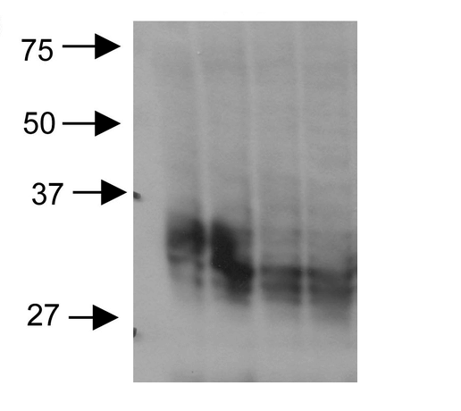 | Calculated MW | 31.5 kDa (unmodified); 35 - 50 kDa (glycosylated) |