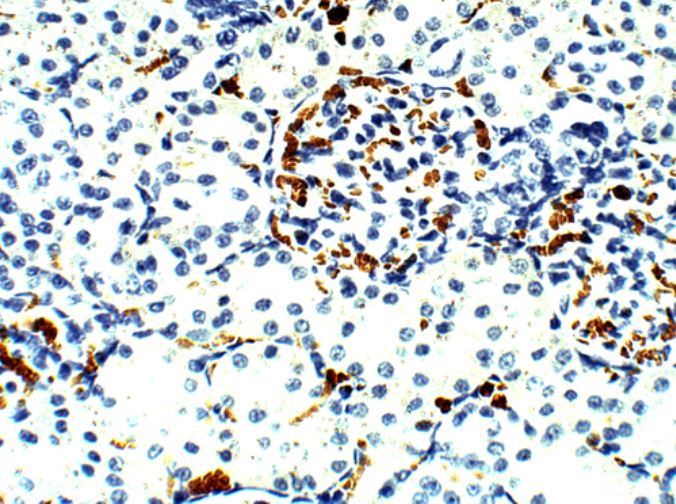 Immunohistochemistry: Formalin-fixed and paraffin-embedded Rat kidney tissue stained with ARG43209 anti-Aquaporin 9 antibody at 1:100 dilution. (40X magnification)