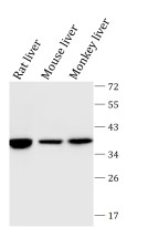 Western blot: Rat Liver, Mouse Liver and Monkey Liver stained with ARG43826 anti-Arginase 1 antibody [2B12].