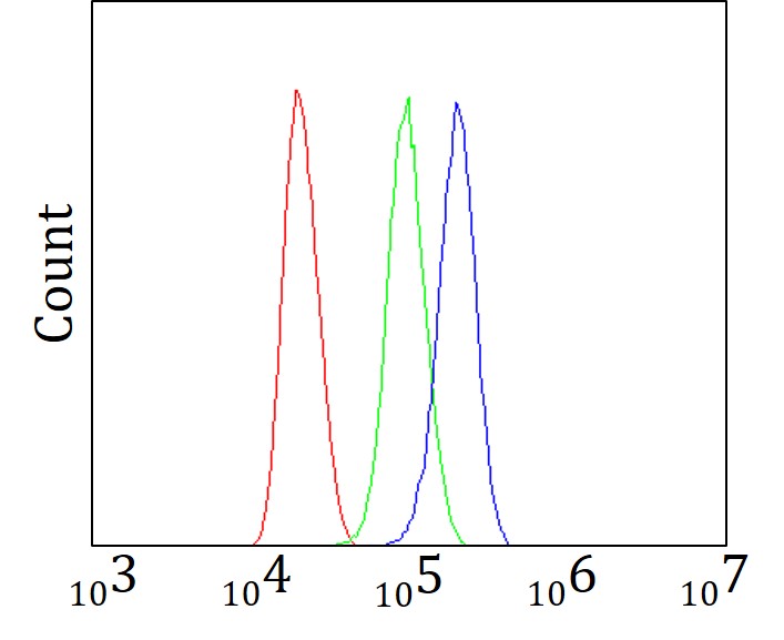 Flow Cytometry: Jurkat cells were stained withARG43826 anti-Arginase 1 antibody [2B12] at 1:500 dilution in 1x PBS/1% BSA for 30 min at RT, followed by Alexa Fluor® 488 labelled secondary antibody. Unlabelled sample (Red) was used as a control.