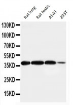 Western blot: Rat lung, Rat testis, A549 and 293T cell lysates stained with ARG59323 anti-Arginase 2 antibody.