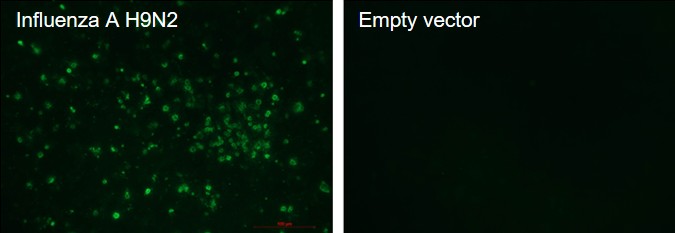 Immunofluorescence: ARG67190 anti-Avian Influenza A H9N2 Hemagglutinin antibody [H9/2G10] were used for detecting Influenza A H9N2 HA protein.