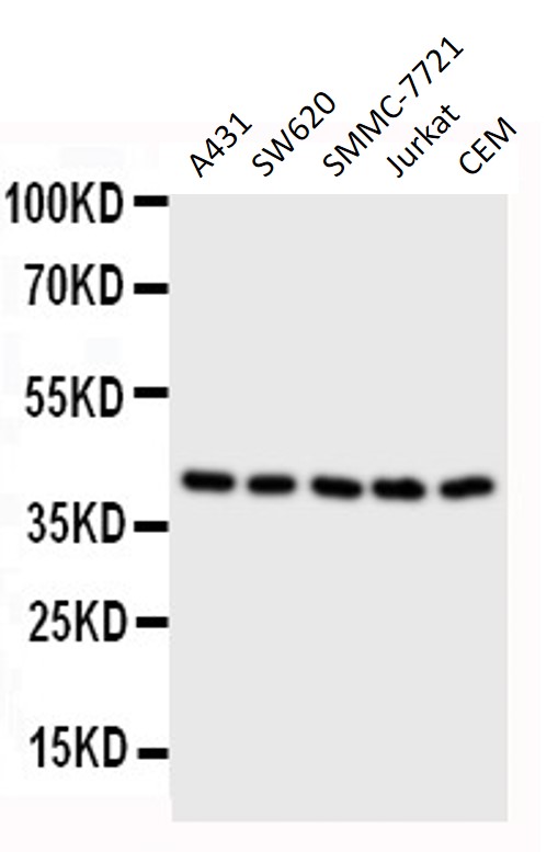 Western blot: 40 µg of A431 whole cell lysate, SW620 whole cell lysate, SMMC-7721 whole cell lysate, Jurkat whole cell lysate and CEM whole cell lysate stained with ARG58303 anti-BCAT2 antibody at 0.5 µg/ml dilution.