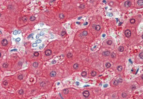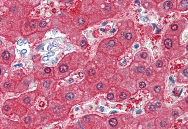 Immunohistochemistry: Paraffin-embedded Human liver tissue. Antigen Retrieval: Steam tissue section in Citrate buffer (pH 6.0). The tissue section was stained with ARG64302 anti-BHMT antibody at 5 µg/ml dilution followed by AP-staining.