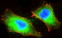 Immunofluorescence: 4% Paraformaldehyde-fixed, 0.1% Triton X-100 permeabilized A549 cells stained with ARG42078 anti-BMP1 antibody (green) at 1:25 dilution. Dylight® 554 Phalloidin (red) for cytoplasmic actin staining. DAPI (blue) for nuclear staining.