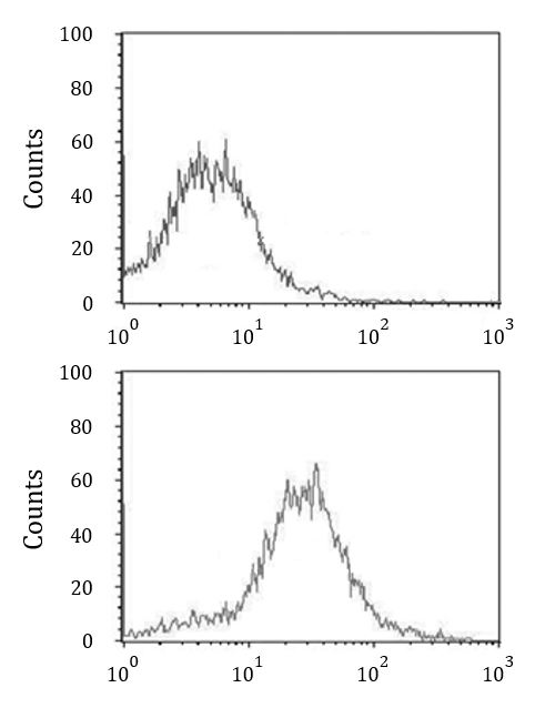 Flow Cytometry: HepG2 cells stained with ARG54832 anti-BMPR2 antibody (bottom histogram) or without primary antibody control (top histogram), followed by incubation with FITC labelled secondary antibody.