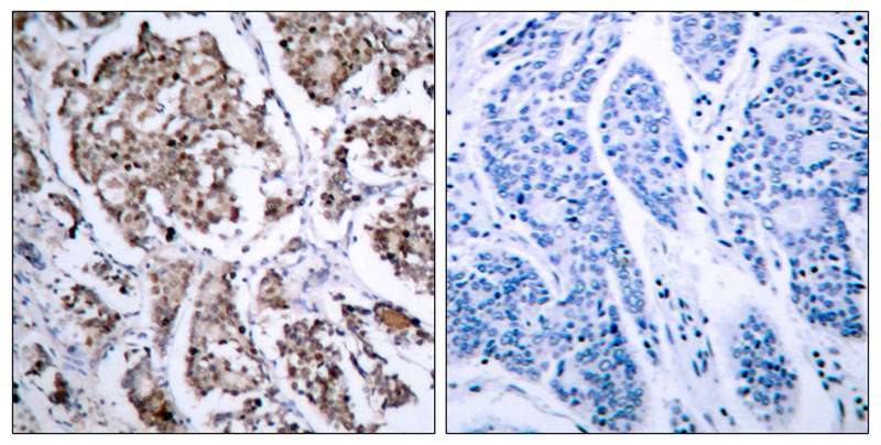 Immunohistochemistry: Paraffin-embedded Human breast carcinoma tissue stained with ARG51572 anti-Bad phospho (Ser155) antibody.
