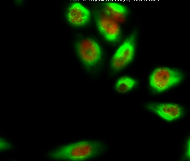 Immunofluorescence: HeLa cells stained with anti-Dnmt3b antibody (red) at 1:200 dilution, overnight at 4°C. Cells were co-stained with ARG66866 anti-Bcl 2 antibody (green) at 1:200 dilution, overnight at 4°C.