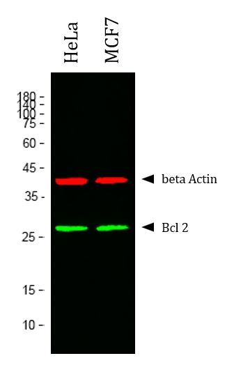 Western blot: HeLa and MCF7 cell lysates stained with ARG66866 anti-Bcl 2 antibody (green) at 1:1000 dilution, overnight at 4°C. The blots were co-stained with anti-beta Actin antibody (red) at 1:5000 dilution, overnight at 4°C.