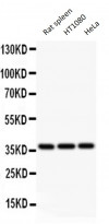 Western blot: 50 µg of Rat spleen, 40 µg of HT1080 whole cell lysate and 40 µg of HeLa whole cell lysate stained with ARG58309 anti-Bmi 1 antibody at 0.5 µg/ml dilution.