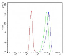 Flow Cytometry: Caco-2 cells were blocked with 10% normal goat serum and then stained with ARG59212 anti-CCDC6 antibody (blue) at 1 µg/10^6 cells for 30 min at 20°C, followed by incubation with DyLight®488 labelled secondary antibody. Isotype control antibody (green) was rabbit IgG (1 µg/10^6 cells) used under the same conditions. Unlabelled sample (red) was also used as a control.