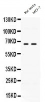 Western blot: Rat testis and MCF-7 whole cell lysate stained with ARG59212 anti-CCDC6 antibody at 0.5 µg/ml dilution.