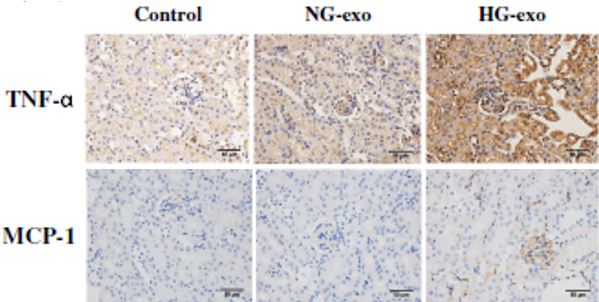 Immunohistochemistry: Mouse kidney stained with ARG56590 anti-CCL2 / MCP1 antibody [2.2-4H5-1A11] and ARG10158 anti-TNF alpha antibody [2C8] .