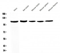 Western blot: 50 µg of samples under reducing conditions. HeLa, Rat testis, Mouse testis, Mouse spleen and Mouse thymus lysates stained with ARG59202 anti-CCP110 / Cep110 antibody at 0.5 µg/ml, overnight at 4°C.