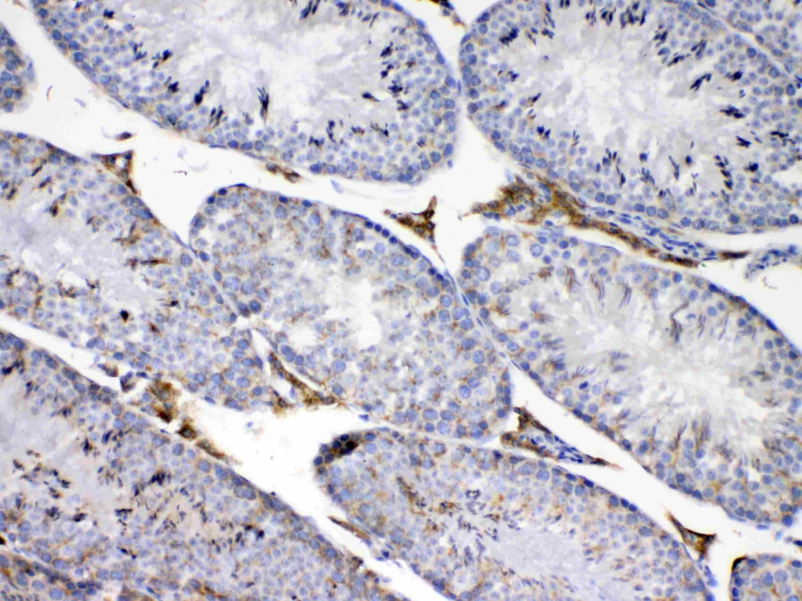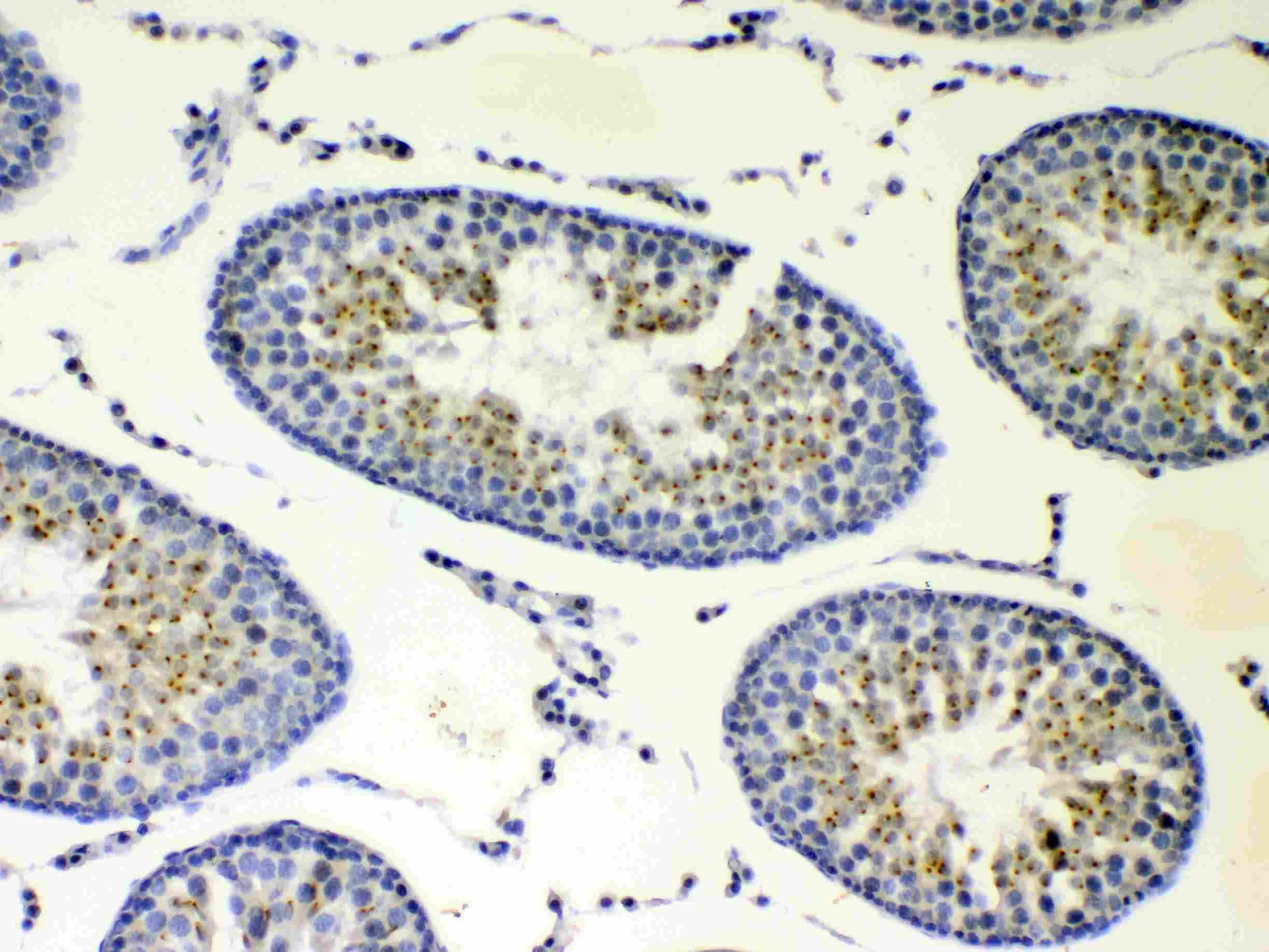 Immunohistochemistry: Paraffin-embedded Rat testis tissue. Antigen Retrieval: Heat mediated was performed in Citrate buffer (pH 6.0, epitope retrieval solution) for 20 min. The tissue section was blocked with 10% goat serum. The tissue section was then stained with ARG59202 anti-CCP110 / Cep110 antibody at 1 µg/ml dilution, overnight at 4°C.