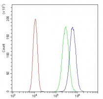 Flow Cytometry: SiHa cells were blocked with 10% normal goat serum and then stained with ARG40369 anti-CD119 / IFN gamma R1 antibody (blue) at 1 µg/10^6 cells for 30 min at 20°C, followed by incubation with DyLight®488 labelled secondary antibody. Isotype control antibody (green) was rabbit IgG (1 µg/10^6 cells) used under the same conditions. Unlabelled sample (red) was also used as a control.