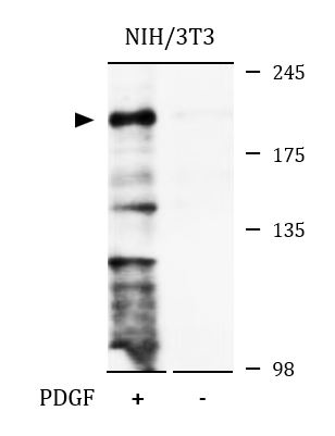 Western blot: NIH/3T3 cells were untreated (right) or treated by PDGF (100 ng/ml, left) at 37°C for 30 minutes after serum-starvation overnight. 25 µg of cell lysates were stained with ARG43445 anti-CD140b / PDGFRB phospho (Tyr1021) antibody at 1:1000 dilution.
