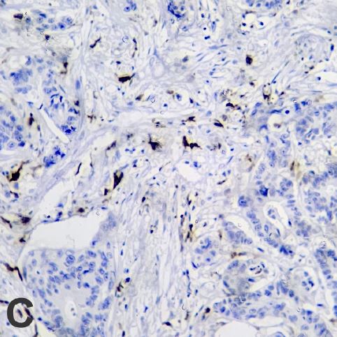 Immunohistochemistry: Human colorectal cancer stained with ARG66630 anti-CD163 antibody [SQab19148].