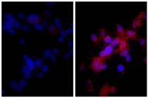 Immunofluorescence: Human hepatocellular carcinoma cell line HepG2 stained with Rabbit IgG isotype control (left) and ARG22343 anti-CD262 / TRAIL R2 antibody (right) followed by ARG21782 Donkey anti-Rabbit IgG (H+L) antibody (Biotin) (pre-adsorbed), Streptavidin (Cy3) and DAPI.