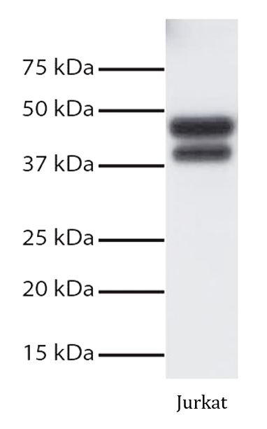 Western blot: Jurkat cell lysate stained with ARG22343 anti-CD262 / TRAIL R2 antibody. Secondary antibody: ARG23768 Goat anti-Rabbit IgG (H+L) antibody (HRP) (pre-adsorbed).