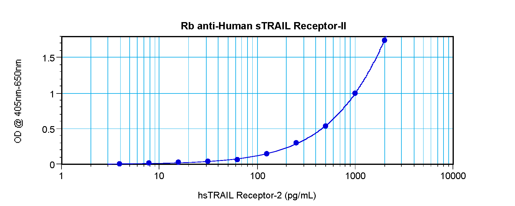Sandwich ELISA: ARG66144 anti-CD262 / TRAIL R2 antibody as a capture antibody at 0.5 - 2.0 µg/ml combined with ARG66145 anti-DR5 antibody (Biotin) as a detection antibody. Results of a typical standard run with optical density reading at 405 - 650 nm.