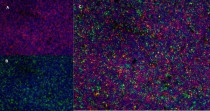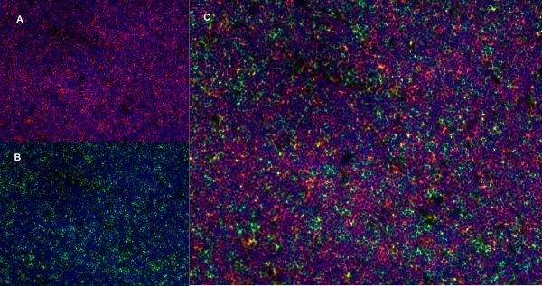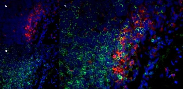 Immunohistochemistry: Rat lymph node cryosection stained with Mouse anti-Rat CD11b antibody [OX-42[ (red) in A and anti-CD8 antibody [OX-8] (green) in B. C is the merged image stained with nuclei counterstained in blue using DAPI.