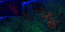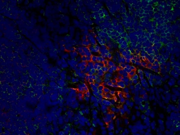 Immunohistochemistry: Rat lymph node cryosection stained with Mouse anti-Rat CD25 antibody [OX-35] (red) and anti-CD8 antibody [OX-8] (green). Cell nuclei were stained with DAPI (blue) (High-power field).