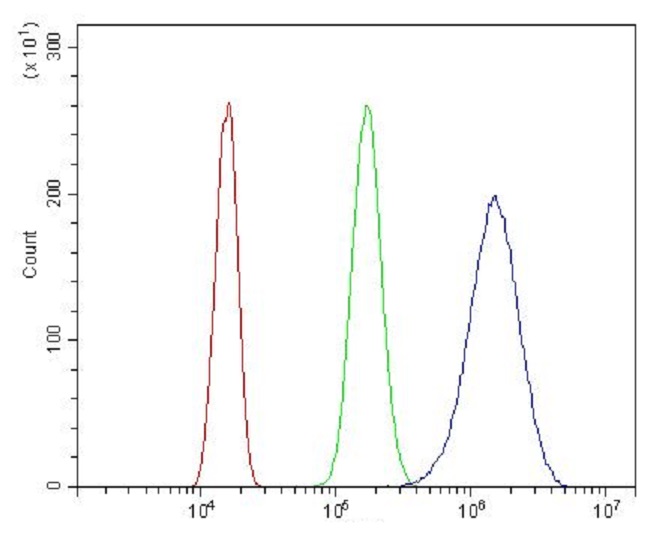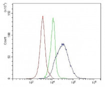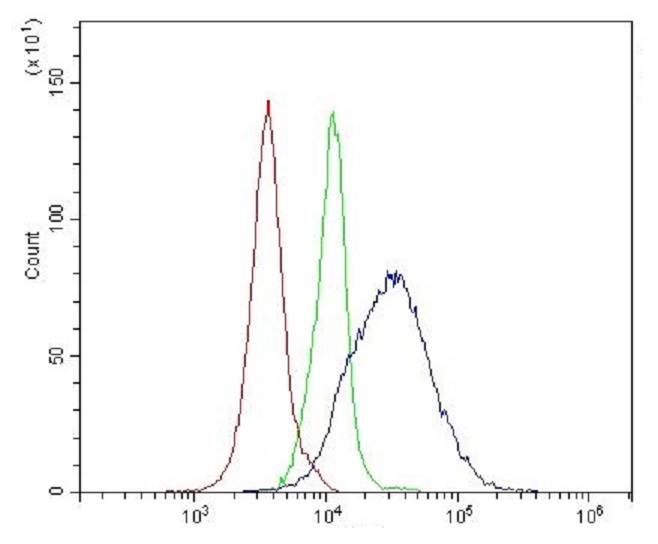 Flow Cytometry: Neuro-2a cells were blocked with 10% normal goat serum and then stained with ARG40691 anti-CD81 antibody (blue) at 1 µg/10^6 cells for 30 min at 20°C, followed by incubation with DyLight®488 labelled secondary antibody. Isotype control antibody (green) was rabbit IgG (1 µg/10^6 cells) used under the same conditions. Unlabelled sample (red) was also used as a control.