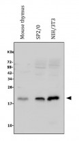 Western blot: 30 µg of sample under reducing conditions. Mouse thymus, SP2/0, NIH/3T3 whole cell lysates stained with ARG40691 anti-CD81 antibody at 0.5 µg/ml dilution, overnight at 4°C.