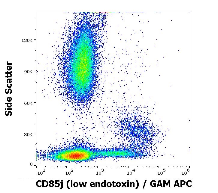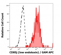 Flow Cytometry: Separation of Human CD85j positive B cells (red-filled) from neutrophil granulocytes (black-dashed). Human peripheral whole blood stained with ARG42246 anti-CD85j / LIR1 antibody [GHI/75] (low endotoxin) at 1 µg/ml dilution, followed by APC-conjugated Goat anti-Mouse antibody.