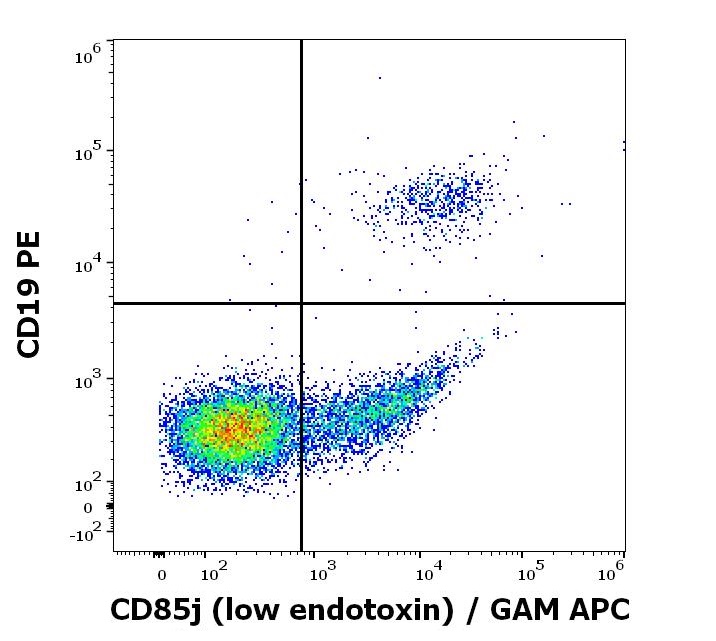 Flow Cytometry: Human lymphocytes stained with ARG42246 anti-CD85j / LIR1 antibody [GHI/75] (low endotoxin) at 1 µg/ml dilution, followed by APC-conjugated Goat anti-Mouse antibody. Samples were co-stained with ARG53783 anti-CD19 antibody [LT19] (PE) at 20 µl / 100 µl of peripheral whole blood.
