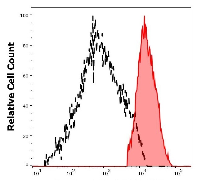 Flow Cytometry: Separation of bovine CD9 positive thrombocytes (red-filled) from lymphocytes (black-dashed). Bovine peripheral whole blood stained with ARG62945 anti-CD9 antibody [IVA50] at 10 µg/ml dilution, followed by APC-conjugated Goat anti-Mouse antibody.