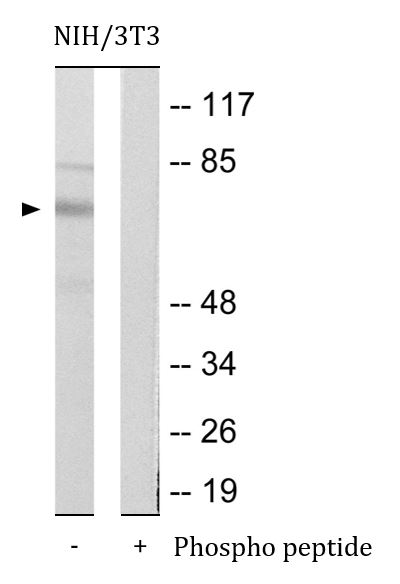 Western blot: NIH/3T3 cells treated with PMA (125 ng/ml for 30 min). Cell lysates stained with ARG66656 anti-CDC25B phospho (Ser323) antibody. The lane on the right is blocked with the phospho peptide.