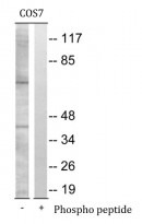 Western blot: COS7 cells treated with etoposide (25 µM for 24 hours). Cell lysates stained with ARG66657 anti-CDC25B phospho (Ser353) antibody. The lane on the right is blocked with the phospho peptide.