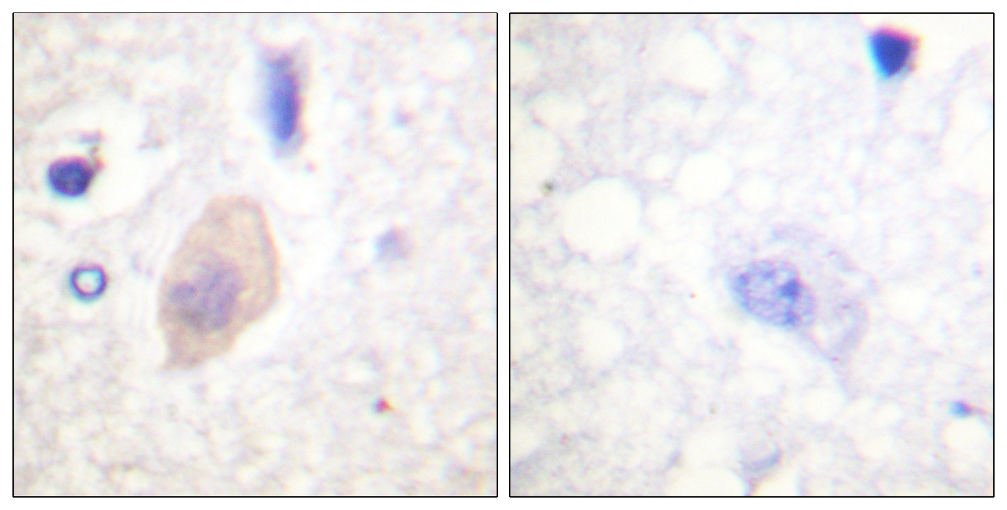Immunohistochemistry: Paraffin-embedded Human brain tissue stained with ARG66657 anti-CDC25B phospho (Ser353) antibody. The picture on the right is blocked with the phospho peptide.