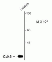 | Application Note | The antibody is specific for the ~ 28kDa Cdk5 protein in Western blots of Rat striatal lysate. The antibody shows no cross reactivity with the Cdk5 cofactor p35 or its degradation product p25. This monoclonal also works well for immunocytochemistry using primary cultured Rat neurons and for immunohistochemistry on mouse brain tissue. * The dilutions indicate recommended starting dilutions and the optimal dilutions or concentrations should be determined by the scientist. |