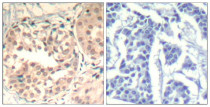 Immunohistochemistry: Paraffin-embedded Human breast carcinoma tissue stained with ARG51829 anti-CDK6 phospho (Tyr13) antibody (left) or the same antibody preincubated with blocking peptide (right).