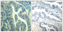 Immunohistochemistry: Paraffin-embedded Human colon carcinoma tissue stained with ARG51830 anti-CDK6 phospho (Tyr24) antibody (left) or the same antibody preincubated with blocking peptide (right).