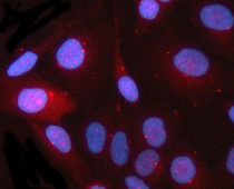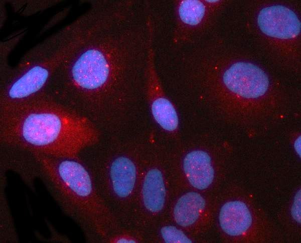 Immunofluorescence: HeLa stained with ARG44537 anti-CEP164 antibody at 5 μg/ml dilution.