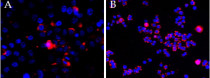 Immunofluorescence: OPCT-1 (A) and MDA468 (B) cells stained with ARG65094 anti-CEP290 antibody (red) at 2.5 µg/ml dilution, overnight. DAPI (blue) for nuclear staining.