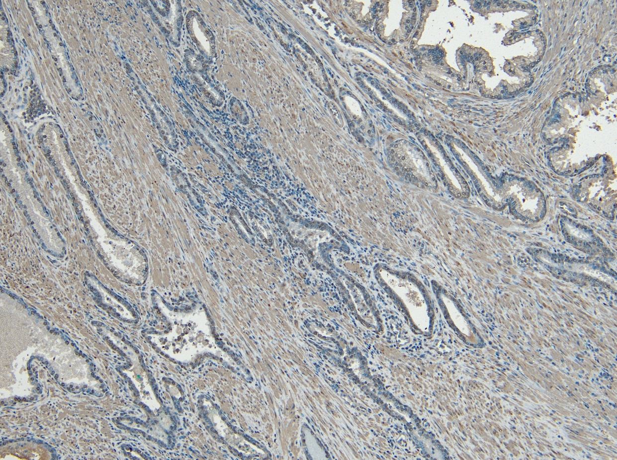 Immunohistochemistry: Paraffin-embedded Human prostate tissue. Antigen Retrieval: Heat mediation was performed in Citrate buffer (pH 6.0). The tissue section was stained with ARG65094 anti-CEP290 antibody at 5 µg/ml dilution followed by HRP-staining.