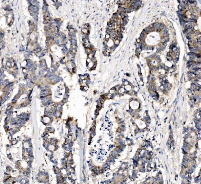 Immunohistochemistry: Human colonic adenocarcinoma stained with ARG45670 anti-CHCHD10 antibody at 2 μg/ml dilution.