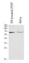 Western blot: UV-treated 293T and untreated HeLa cells. Cell nuclear extracts were stained with ARG66884 anti-CHEK2 antibody at 1:500 dilution.
