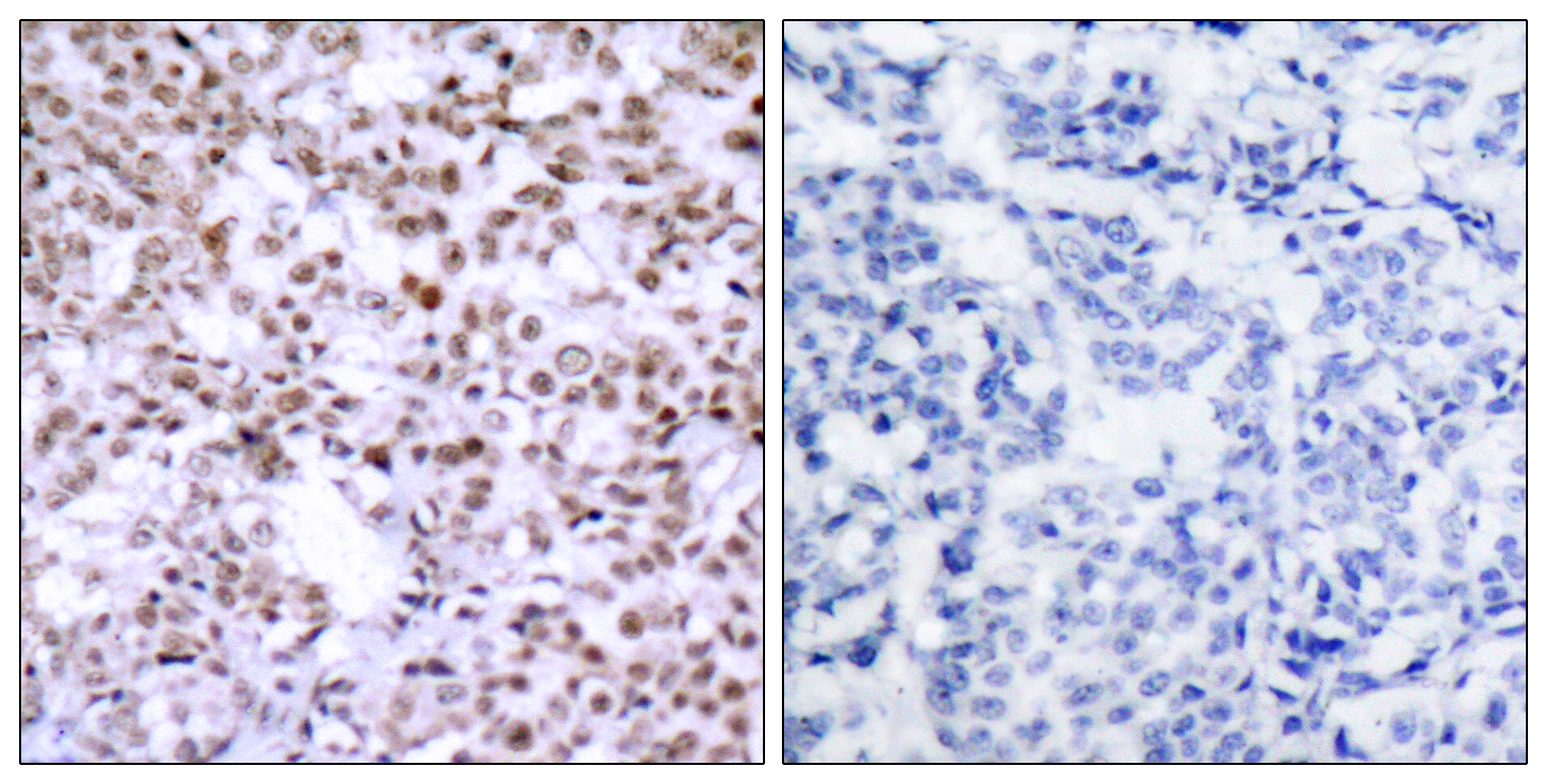 Immunohistochemistry: Paraffin-embedded Human breast carcinoma tissue stained with ARG66884 anti-CHEK2 antibody. The picture on the right is blocked with the synthetic peptide.