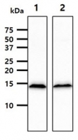 Western blot: 40 µg of 1) K562 cell lysate, 2) MCF7 cell lysate stained with ARG57013 anti-CISD1 / mitoNEET antibody [1A8] at 1:1000.
